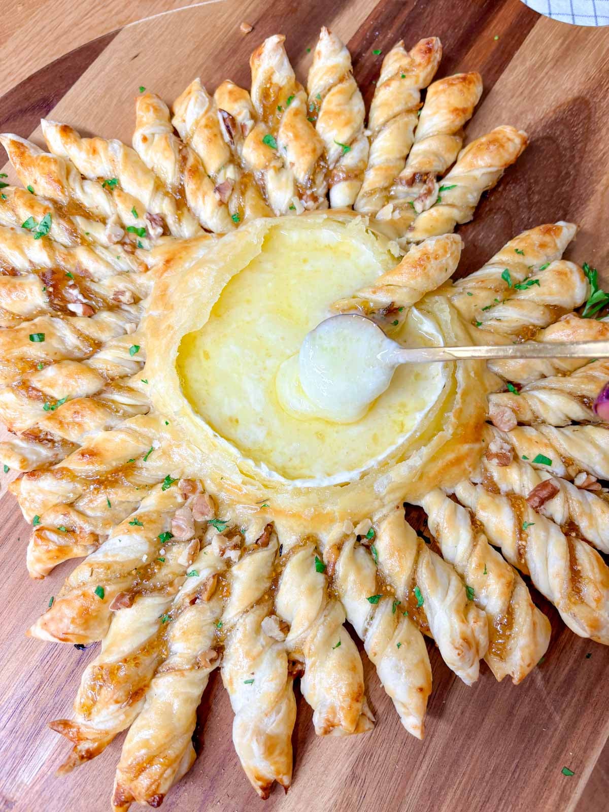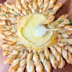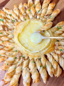 - To serve, pull twisted pieces of pastry off and dip in the melted brie. You can also serve with apple slices of pear slices to dip and enjoy!