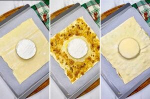 - Brush some of the egg wash on the puff pastry along the ½ inch border around the cheese. This will help create a seal with the second piece of puff pasty that will be placed on top.