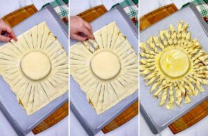 - Using a sharp knife, carefully make cuts, starting ½ inch away from the brie to the outer edge of the pastry. Continue making cuts all around the brie ring to create ½ inch strips of pastry, angling the knife as you go around the circle of brie.