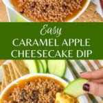 Caramel Apple Cheesecake Dip is a fun twist on classic caramel apples and cheesecake! A rich and creamy cheesecake dip is topped with caramel sauce, toffee bits, and mini chocolate chips. Served with apple slices, graham crackers, and cookies to dip it's one of the easiest and most divine desserts you can make!