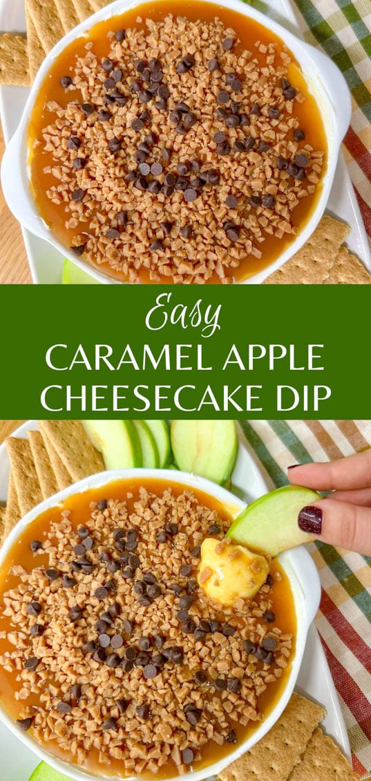 This dip is a fun twist on two classic treats. A creamy cheesecake dip is topped with rich and sticky caramel sauce. Toffee bits and mini chocolate chips garnish the top of the dip for added flavor and texture. Served with green apple slices to dip it taste just like a caramel apple and cheesecake! Graham crackers are perfect for dipping to get that great caramel cheesecake flavor! It's one of our family's favorite dips.