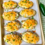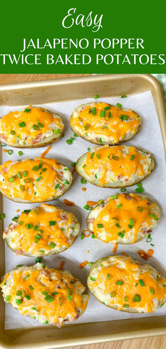 We love everything about jalapeno poppers and we continue to make fun and unique versions of them. Our jalapeno popper mashed potatoes have been a fan favorite side dish for over 4 years so we knew we had to make a twice baked potato version that's stuffed into crispy potato skins! These are a fun game day appetizer, holiday appetizer or side, or a great dish to bring to a potluck as everyone loves baked potatoes!