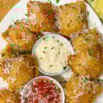 I recommend only making this recipe up to 2 days in advance. Reheat in the oven or air fryer before serving and enjoy. You can already batter all of the ravioli and keep them in the fridge for 2-3 hours before cooking them.