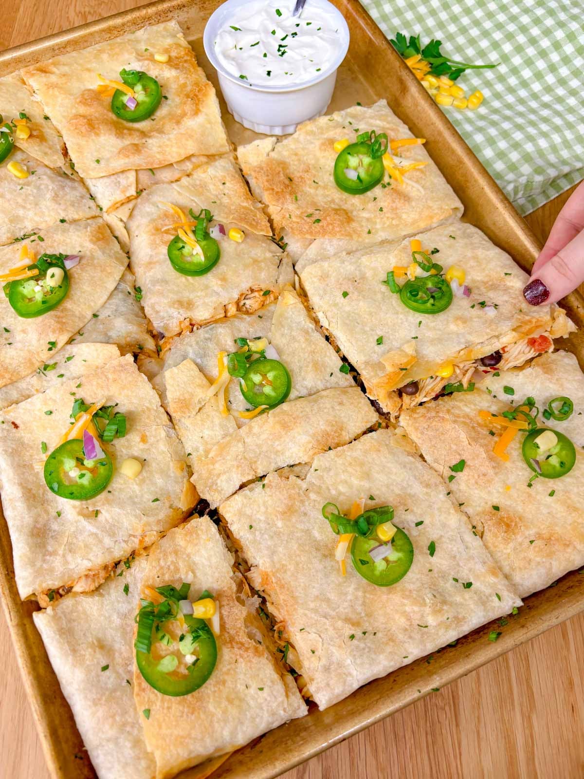 A sheet pan quesadilla is a fun and unique way to make 12 quesadillas at a time. Burrito sized tortillas are placed on a sheet pan and stuffed with the best quesadilla filling. The filling is packed with shredded rotisserie chicken, beans, corn, onions, tomatoes, and cheese and is spread onto the tortillas. The tortillas are folded over the filling and another sheet pan is placed on top. Baked in the oven until the tortillas are oh so crispy and the filling is rich and cheesy, these are simply divine. Served with salsa and sour cream to dip, they will be devoured in seconds!