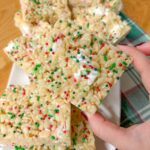 Sugar Cookie Rice Krispie Treats are the perfect colorful and fun no bake treat. Sweet, gooey, and sticky rice krispie treats are packed with mini marshmallows, sugar cookie mix, and sprinkles. They are the simplest no bake dessert that can be customized for the holidays year round!